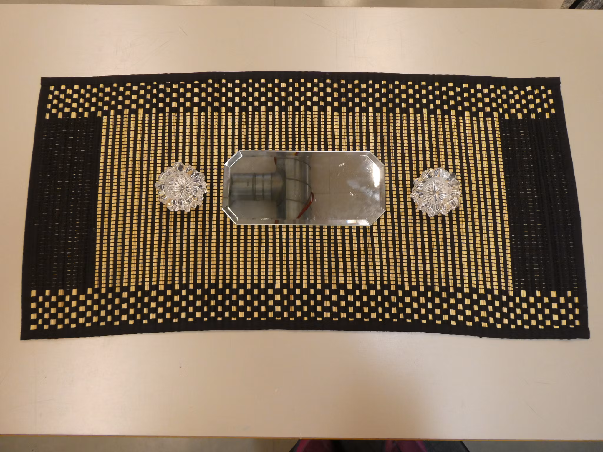 Løper med pyntespeil og lysestaker til telys (krystall). 50,- På lager. Legg i handlekurv Produktbeskrivning Tilbakemeldinger Få bruksmerker. Løperen er 85 cm. Pyntespeilet er 25 cm.